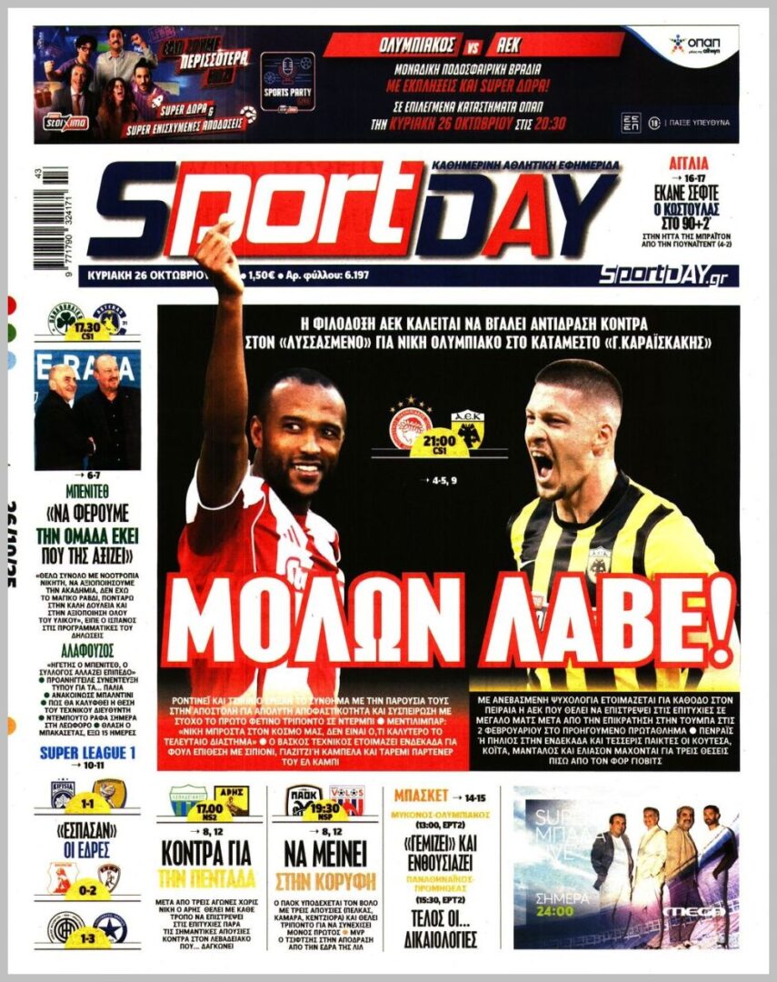 Τα αθλητικά πρωτοσέλιδα της Κυριακής 26/10