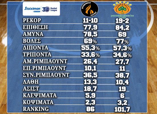 – Σημαντική πτώση παρουσιάζει το ποσοστό της αχαϊκής ομάδας στις βολές όταν αγωνίζεται στο γήπεδο της, αφού εκτελεί με 64,6% έναντι του 73% που έχει ως φιλοξενούμενη.