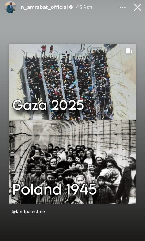 Μάλιστα, στο ποστάρισμά του αποτυπώνεται ο παλαιστινιακός λαός που είναι στα… κάγκελα σαν ένα στρατόπεδο συγκέντρωσης, ενώ ακριβώς από κάτω φαίνονται οι Εβραίοι που βρέθηκαν στα στρατόπεδα συγκέντρωσης των Ναζί, το 1945.