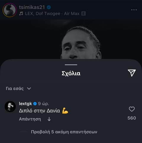 Ο γνωστός ράπερ δεν άφησε ασχολίαστη την ανάρτηση του διεθνούς άσου. Σε σχόλιό του, ο ΛΕΞ έδωσε το σύνθημα για τη νίκη της Εθνικής στο επόμενο ματς με τη Δανία, γράφοντας: «Διπλό στη Δανία».