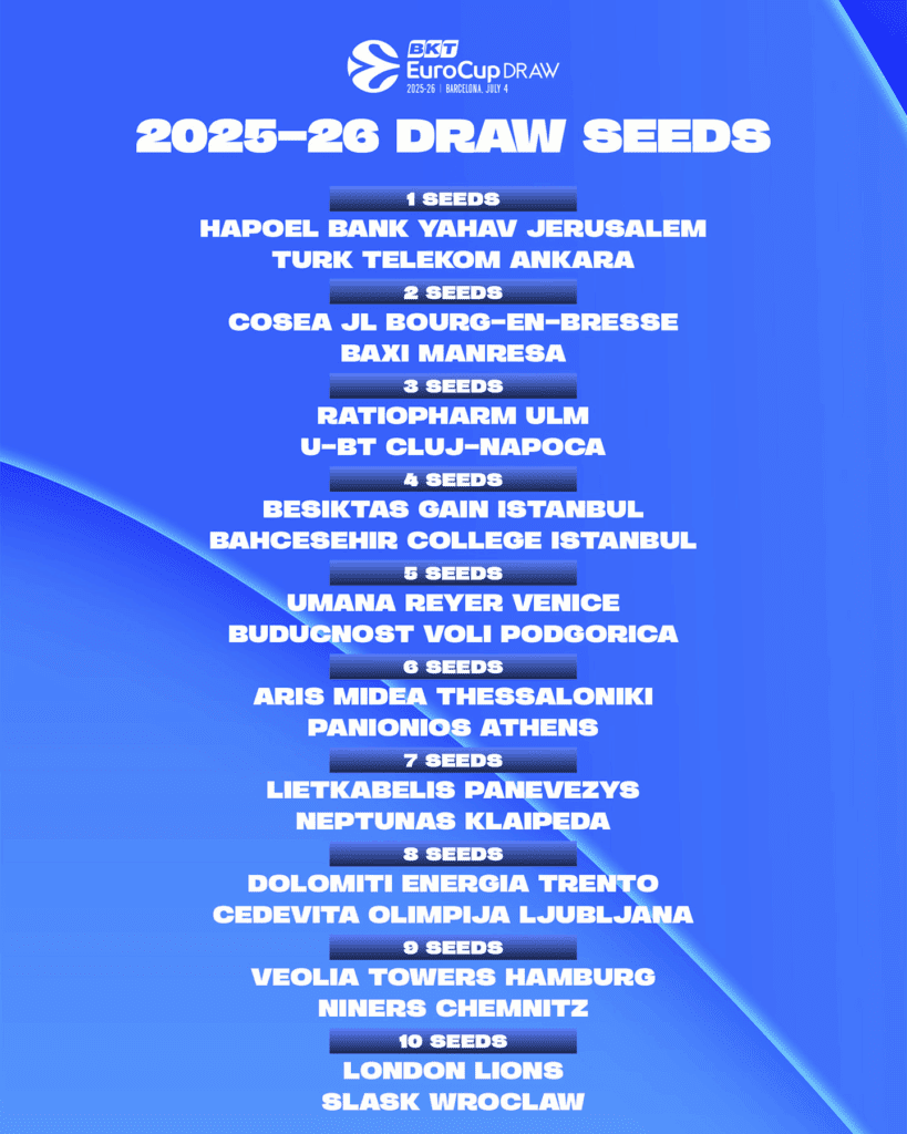 Την Παρασκευή 4 Ιουλίου στις 13:45, στη Βαρκελώνη, θα πραγματοποιηθεί η πολυαναμενόμενη κλήρωση του EuroCup για τη σεζόν 2025-26, με τη συμμετοχή των Άρη και Πανιωνίου να ξεχωρίζει για το ελληνικό ενδιαφέρον.