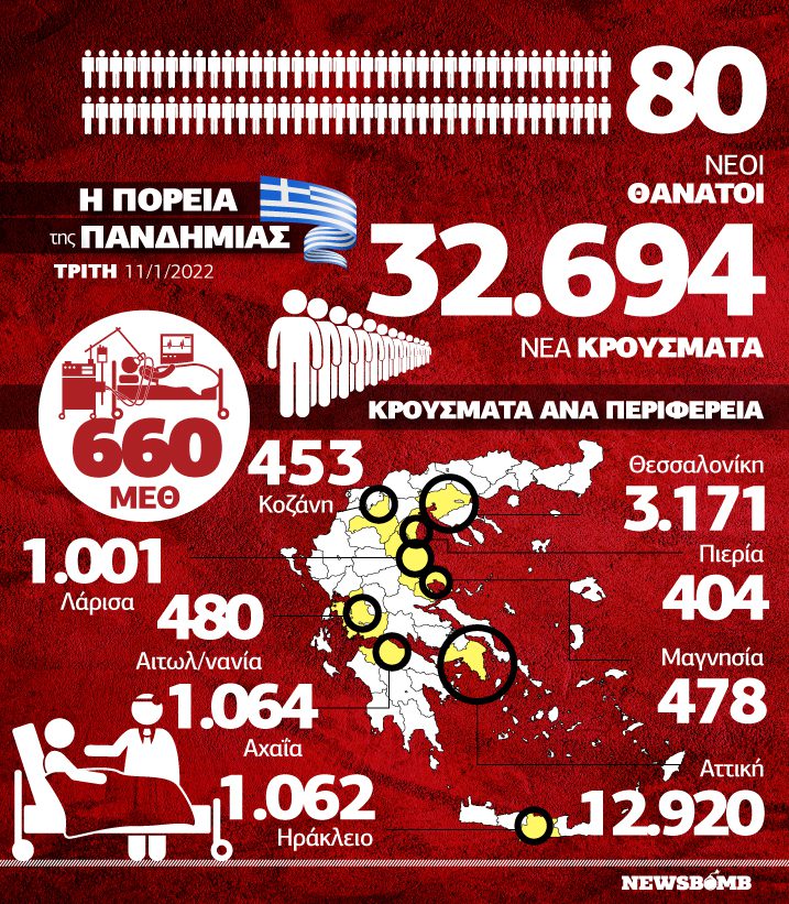 Πιο συγκεκριμένα, ο ΕΟΔΥ ανακοίνωσε 32.694 νέα κρούσματα. Οι νέοι θάνατοι ασθενών με COVID-19 είναι 80, ενώ από την έναρξη της επιδημίας έχουν καταγραφεί συνολικά 21.559 θάνατοι. Το 95.1% είχε υποκείμενο νόσημα ή/και ηλικία 70 ετών και άνω.