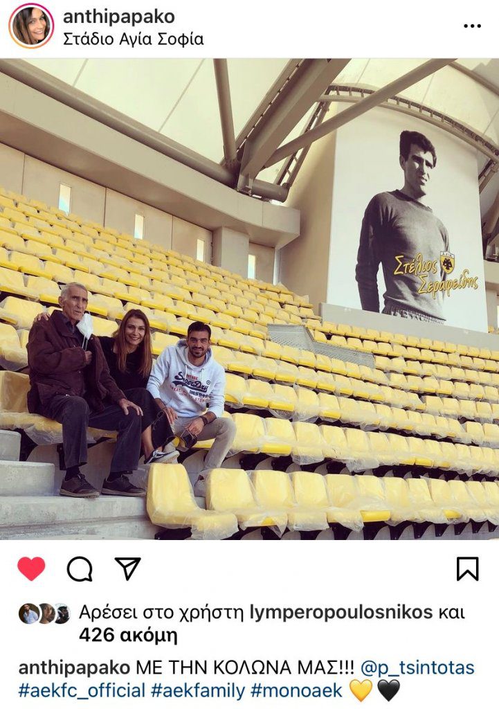 Η Άνθη Παπακωστα, υπεύθυνη δημοσίων σχέσεων της ΑΕΚ, ανέβασε στον λογαριασμό της στο Instagram μια φωτογραφία με τον Στέλιο Σεραφείδη κάτω από τον πυλώνα του στο νέο γήπεδο μαζί με την ίδια και τον Παναγιώτη Τσιντώντα.