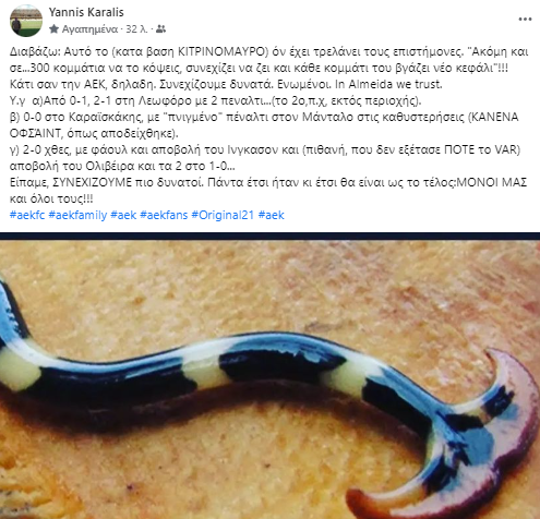 Ο υπεύθυνος Επικοινωνίας της ΑΕΚ ανέφερε αρχικά: «Διαβάζω: Αυτό το (κατά βαση ΚΙΤΡΙΝΟΜΑΥΡΟ) όν έχει τρελάνει τους επιστήμονες. “Ακόμη και σε…300 κομμάτια να το κόψεις, συνεχίζει να ζει και κάθε κομμάτι του βγάζει νέο κεφάλι”!!! Κάτι σαν την ΑΕΚ, δηλαδή. Συνεχίζουμε δυνατά. Ενωμένοι. In Almeida we trust».