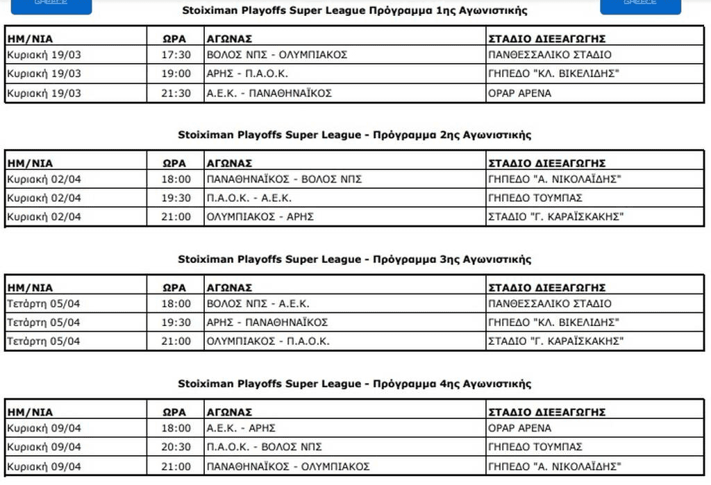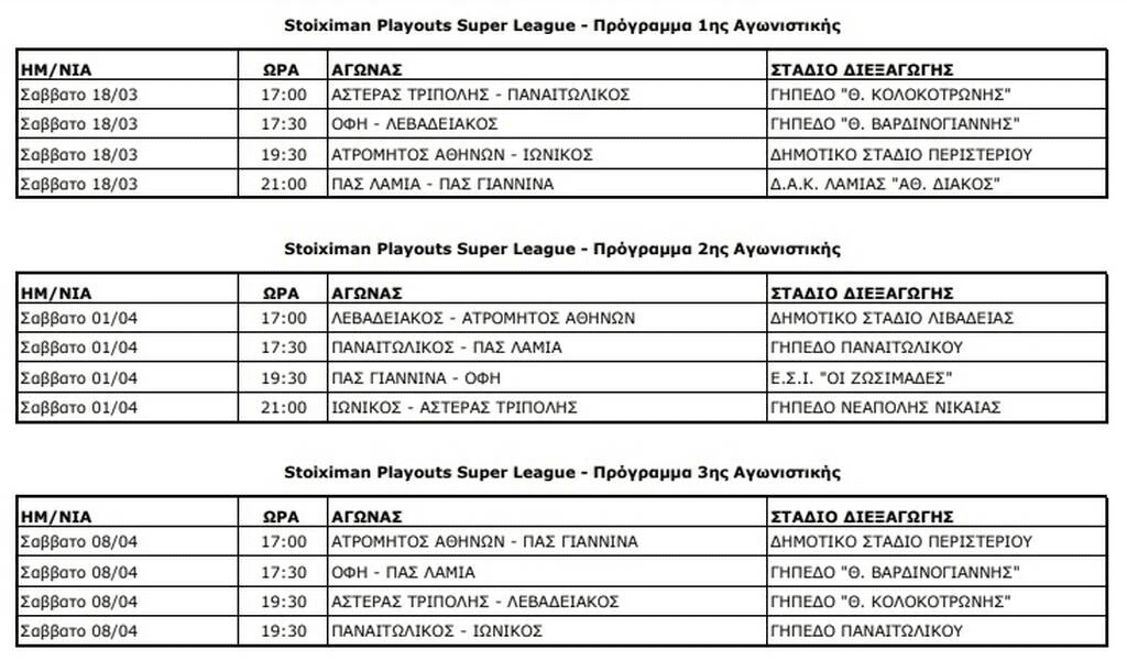 Η Super League ανακοίνωσε το πρόγραμμα των 4 πρώτων αγωνιστικών των Play Off και των 3 πρώτων αγωνιστικών των Play Out.