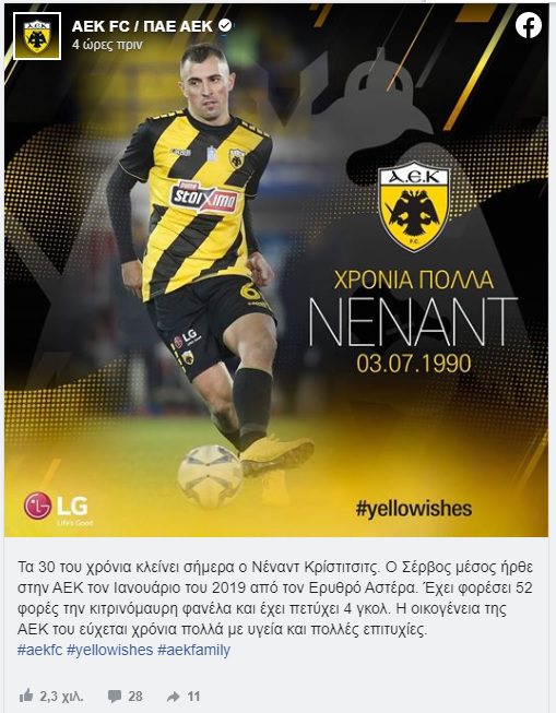 Τις ευχές της στον Νέναντ Κρίστισιτς που σήμερα γίνεται 30 χρονών έστειλε η κιτρινόμαυρη ΠΑΕ...