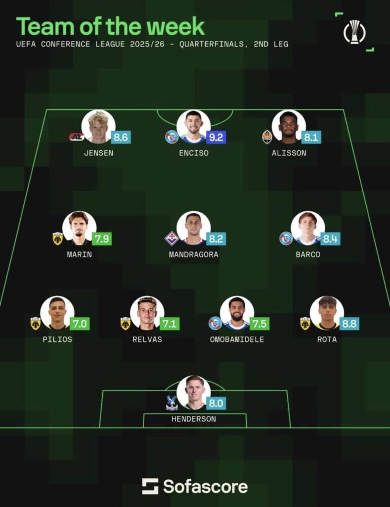 Εντυπωσιακή παρουσία είχε η ΑΕΚ στη ρεβάνς των προημιτελικών του UEFA Europa Conference League, με τέσσερις ποδοσφαιριστές της να συμπεριλαμβάνονται στην κορυφαία ενδεκάδα της αγωνιστικής σύμφωνα με το SofaScore.