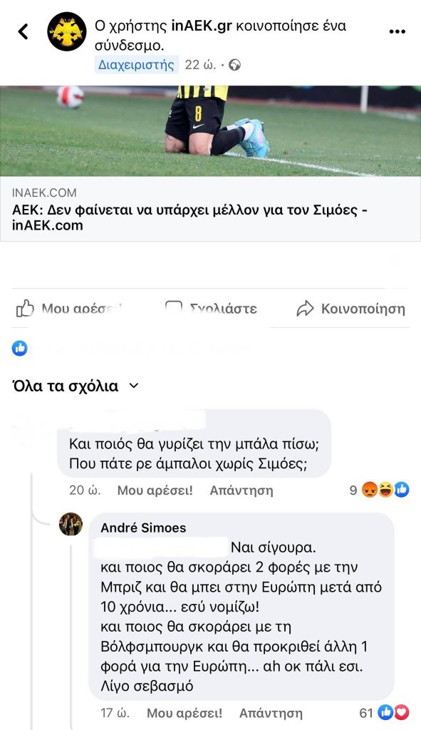 Πάντως, χθες μετά από ρεπορτάζ που κυκλοφόρησε και δημοσιεύθηκε στην ομάδα του inAEK.gr στο Facebook, ο Σιμόες απάντησε σε οπαδό της ΑΕΚ (πιθανόν να χρησιμοποίησε μεταφραστή αφού απάντησε στα Ελληνικά), που δεν σεβάστηκε την προσφορά του και προτίμησε να ειρωνευτεί. Μετά την απάντηση του, ακολούθησαν πολλά σχόλια ΑΕΚτζήδων που εκτιμούν την προσφορά του και θα ήθελαν να συνεχίσει στην ομάδα.