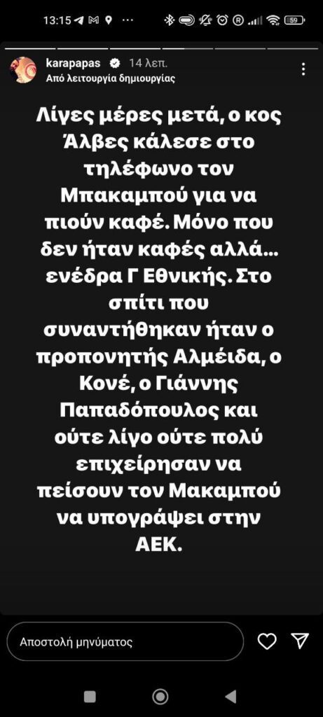 Συγκεκριμένα, ο Καραπαπάς αναφέρεται σε ενέδρα… Γ’ Εθνικής, λέγοντας πως ο καφές που πρότεινε ο Μπρούνο Άλβες στον Κονγκολεζο στράικερ, αποδείχτηκε ένα μίτινγκ με τους ανθρώπους της ΑΕΚ για να τον πείσουν να υπογράψει σε αυτούς.