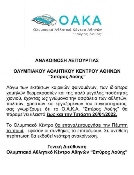 Ετσι, η Γενική Διεύθυνση του Ολυμπιακού Σταδίου ανακοίνωσε πως βάζει «λουκέτο» για σήμερα (25/1) και αύριο (26/1) στις εγκαταστάσεις του και πως θα επαναλειτουργήσει το πρωί της Πέμπτης (27/1), εφόσον φυσικά το επιτρέψουν οι συνθήκες.