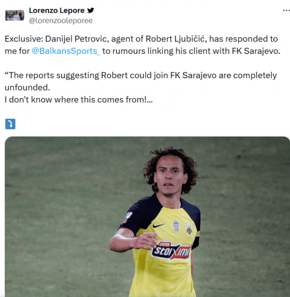 Ο εκπρόσωπος του Ρόμπερτ Λιούμπιτσιτς διέψευσε κατηγορηματικά τα σενάρια που τον ήθελαν να απασχολεί την ΦΚ Σαράγεβο, ενόψει της χειμερινής μεταγραφικής περιόδου.