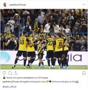Μετά τη χθεσινή νίκη της ΑΕΚ επί του Βόλου με 3-2,ο Παουλίνιο πόσταρε στο ίνσταγκραμ μια φωτογραφία με τους συμπαίχτες του.Ο Πορτογάλος,ο οποίος αγωνίζεται στη θέση δεξί μπακ-χαφ έγραψε στη λεζάντα της φωτογραφίας ότι όλοι μαζί θέλουμε περισσότερα.
