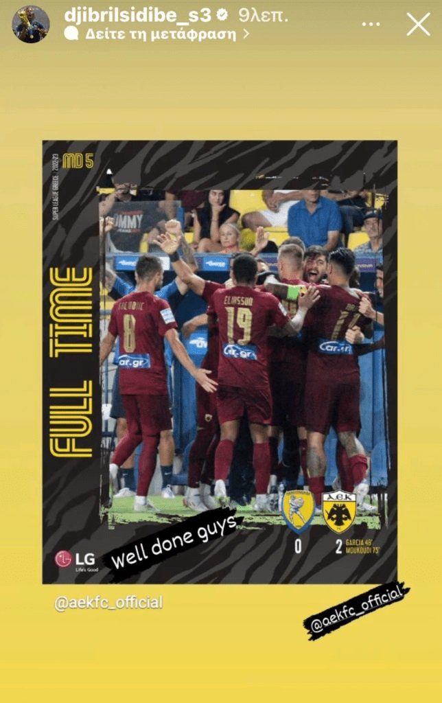 Ο Τζιμπρίλ Σιντιμπέ μετά το τέλος του αγώνα με τον Παναιτωλικό ανάρτησε την φωτογραφία της ΠΑΕ ΑΕΚ με το τελικό σκορ της νικηφόρας αναμέτρησης στο Αγρίνιο, γράφοντας “Μπράβο παιδιά”.