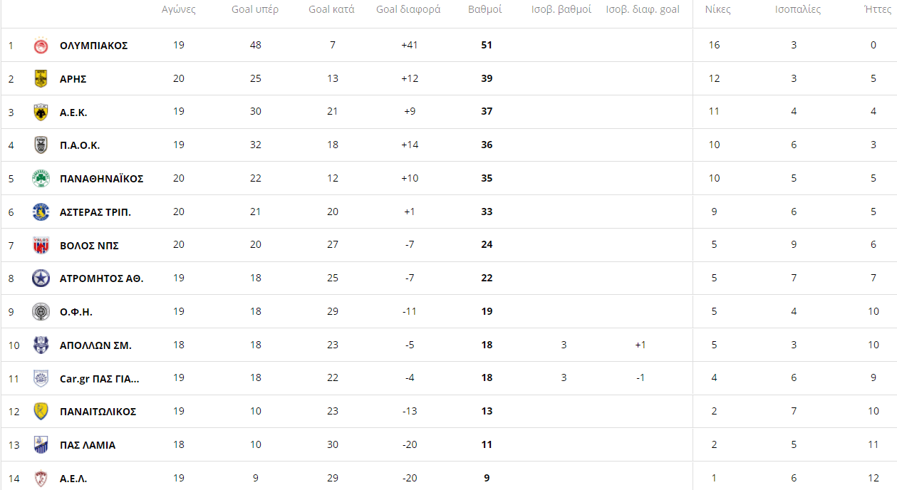 Ο Άρης ηττήθηκε με ανατροπή (2-1) στην Τρίπολη από τον Αστέρα. Έπειτα, ο Παναθηναϊκός αναδείχθηκε ισόπαλος (0-0) με την Λαμία στην Λ. Αλεξάνδρας. Έτσι, η ΑΕΚ αν πάρει αύριο το διπλό στο Ηράκλειο κόντρα στον ΟΦΗ θα ανέβει μόνη της στην 2η θέση στο +1 από τον Άρη και στο +5 από τον Παναθηναϊκό.