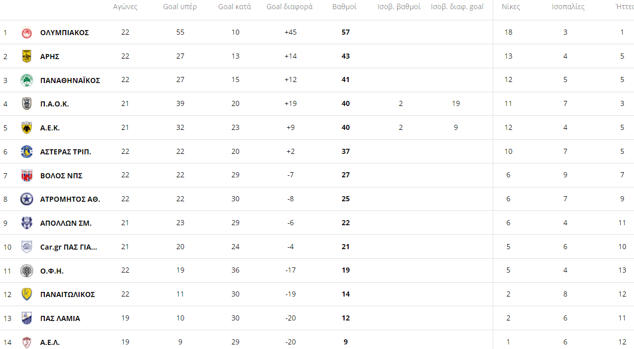 Super League: Η βαθμολογία του πρωταθλήματος (14/2)