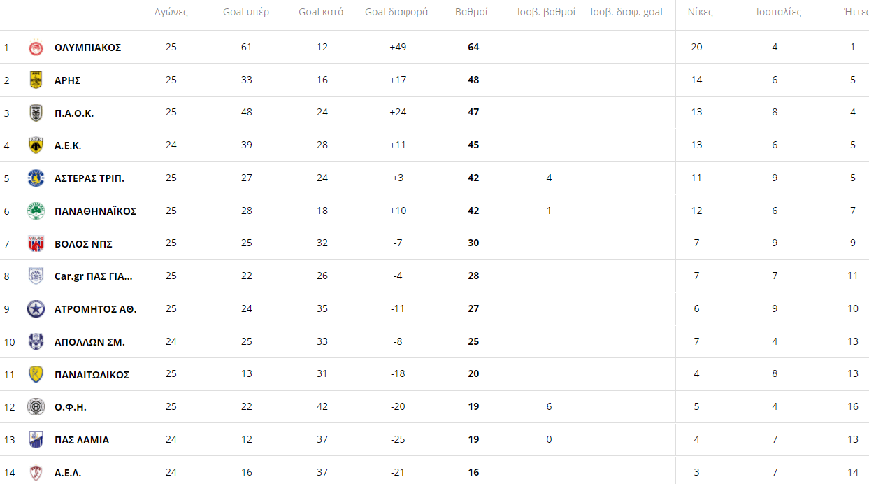 Έτσι, ο πρώτος ανέβηκε στους 47 και ο Άρης στους 48. Αν και εφόσον η ΑΕΚ αύριο κάνει το καθήκον της και νικήσει τον Απόλλωνα Σμύρνης τότε θα “πιάσει” τον Άρη στην 2η θέση.