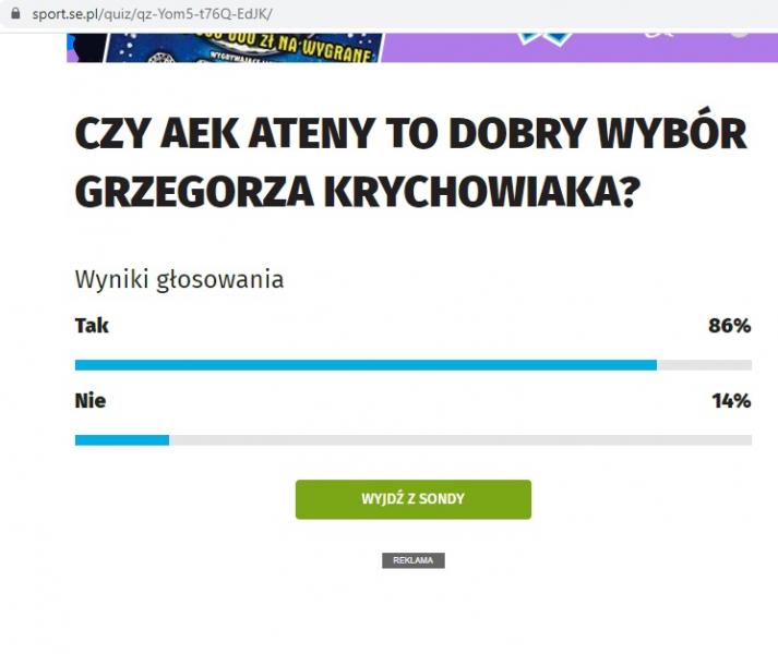 Συγκεκριμένα, στην ιστοσελίδα «sport.se.pl» υπάρχει γκάλοπ, στο οποίο οι αναγνώστες της ιστοσελίδας καλούνται να απαντήσουν με «ναι ή όχι» στο ερώτημα αν η επιλογή της ΑΕΚ είναι καλή για τον σταρ της Κράσνονταρ. Και σύμφωνα με τα αποτελέσματα οι περισσότεροι είναι θετικοί.
