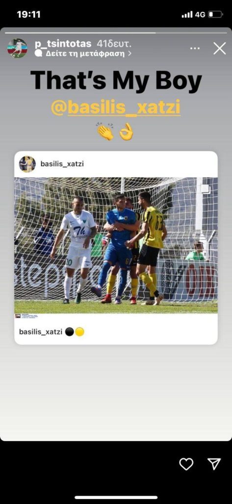 Ο Παναγιώτης Τσιντώτας μετά την λήξη του αγώνα με story στο instagram έσπευσε να συγχαρεί τον Χατζηεμμανουήλ για αυτήν την επέμβαση γράφοντας: «Αυτό είναι το αγόρι μου».