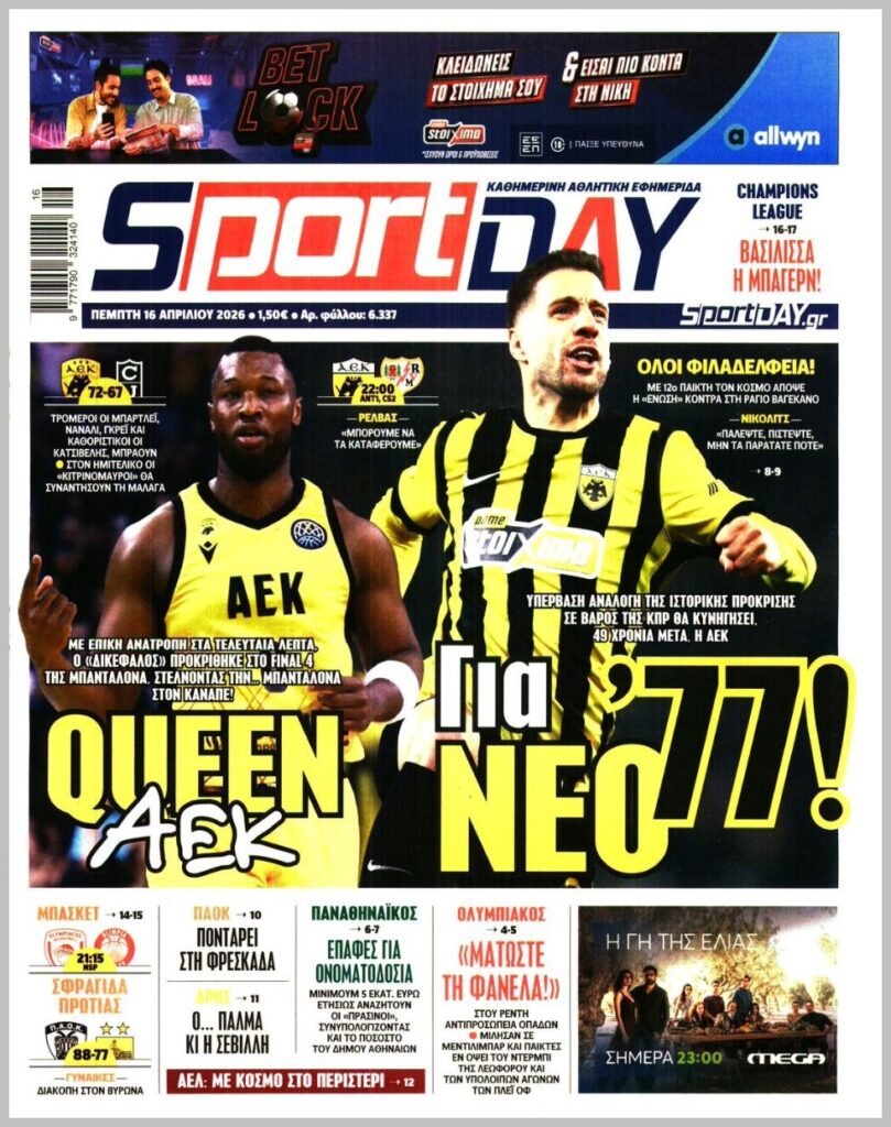 Τα αθλητικά πρωτοσέλιδα της Πέμπτης 16/4