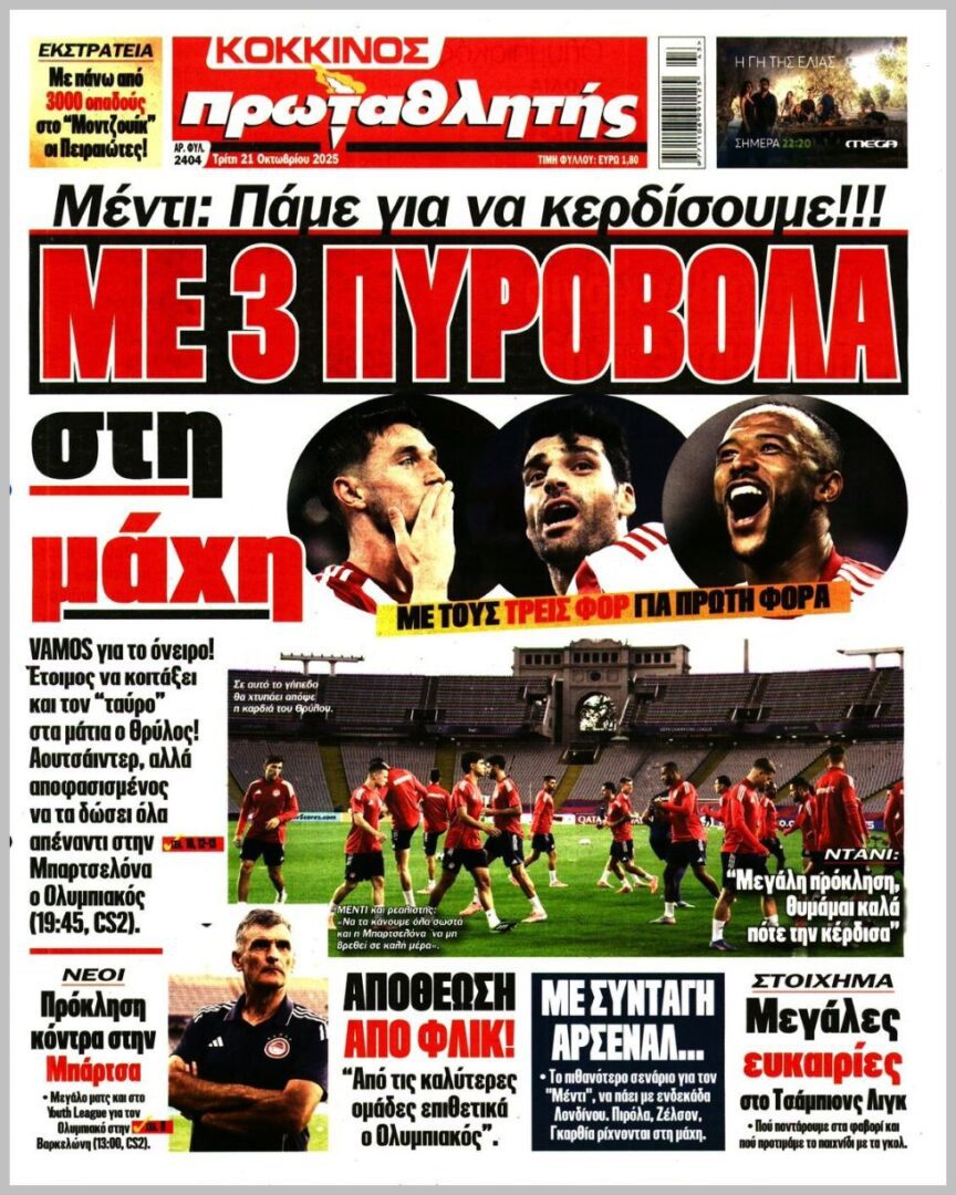 Τα αθλητικά πρωτοσέλιδα της Τρίτης 21/10