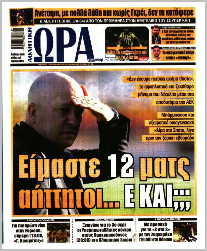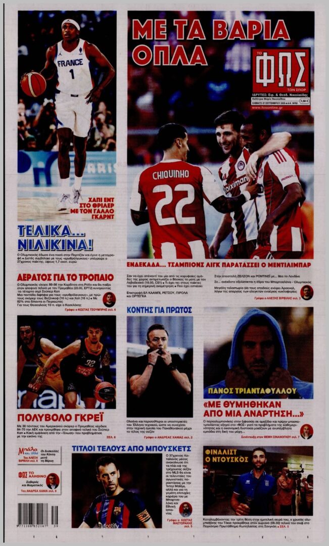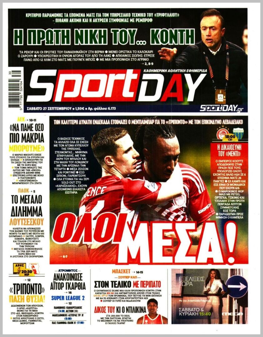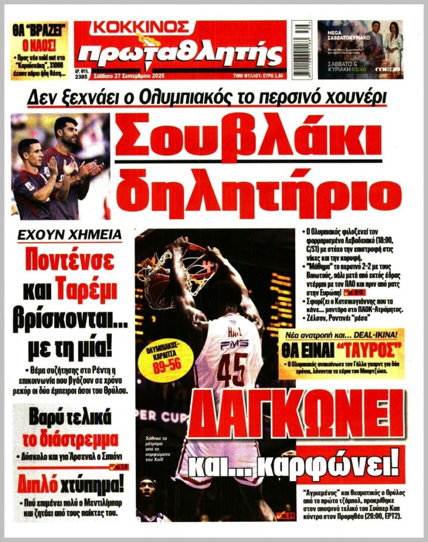 Τα αθλητικά πρωτοσέλιδα του Σαββάτου 27/9
