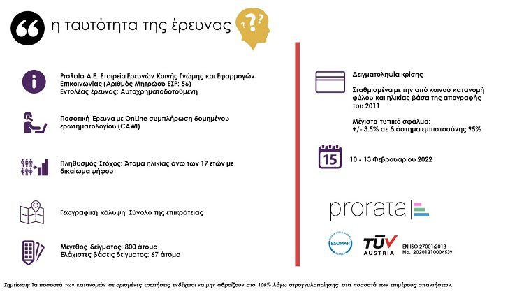 Η πανελλαδικής κάλυψης έρευνα επικαιρότητας σε δείγμα 800 ατόμων διεξήχθη κατά το διάστημα 10 – 13 Φεβρουαρίου 2022.