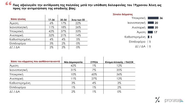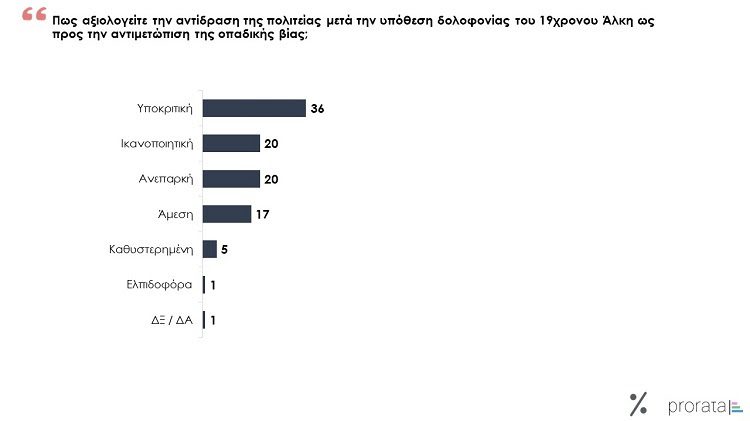 Η αντίδραση της πολιτείας μετά τη δολοφονία του 19χρονου Άλκη ως προς την αντιμετώπιση της οπαδικής βίας, αξιολογείται με αρνητικό πρόσημο από την πλειονότητα των συμμετεχόντων. Ειδικότερα, το 36% χαρακτηρίζει ως «υποκριτική» την αντίδραση της πολιτείας, το 20% ως «ανεπαρκή» και το 5% ως «καθυστερημένη».