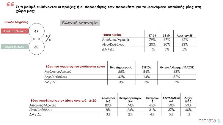 Αντίθετα, το 20% χαρακτηρίζει την αντίδραση ως «ικανοποιητική», το 17% ως «άμεση» και μόλις το 1% ως «ελπιδοφόρα». Τέλος, παρατηρείται και σχετική διαφοροποίηση των απαντήσεων στη βάση της κομματικής εγγύτητας των πολιτών.