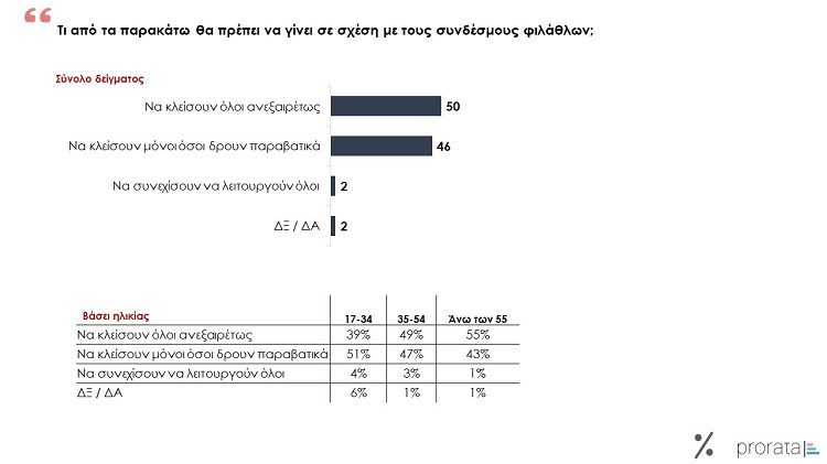 Σχετικά με τη διαχείριση των συνδέσμων των φιλάθλων, η κοινή γνώμη μοιάζει σχετικά μοιρασμένη μεταξύ δύο απόψεων. Μια μεγάλη μερίδα διατηρεί την άποψη πως οι παρεμβάσεις σε αυτούς θα πρέπει να είναι δραστικές με το οριστικό κλείσιμο τους (49%) και μια άλλη εξίσου μεγάλη μερίδα ότι θα πρέπει να κλείνουν οριστικά μόνο όσοι εξ’ αυτών δρουν παραβατικά (46%). Παράλληλα, μόλις το 2% τάσσεται με την άποψη ότι οι σύνδεσμοι των φιλάθλων πρέπει να συνεχίσουν να λειτουργούν κανονικά ως έχει, ενώ τέλος ενδιαφέρον παρουσιάζει το εύρημα σύμφωνα με το οποίο οι μεγαλύτερες ηλικιακές κατηγορίες επιθυμούν αυστηρότερα μέτρα απέναντι στους συνδέσμους φιλάθλων συγκριτικά με τις μικρότερες ηλικιακές κατηγορίες.